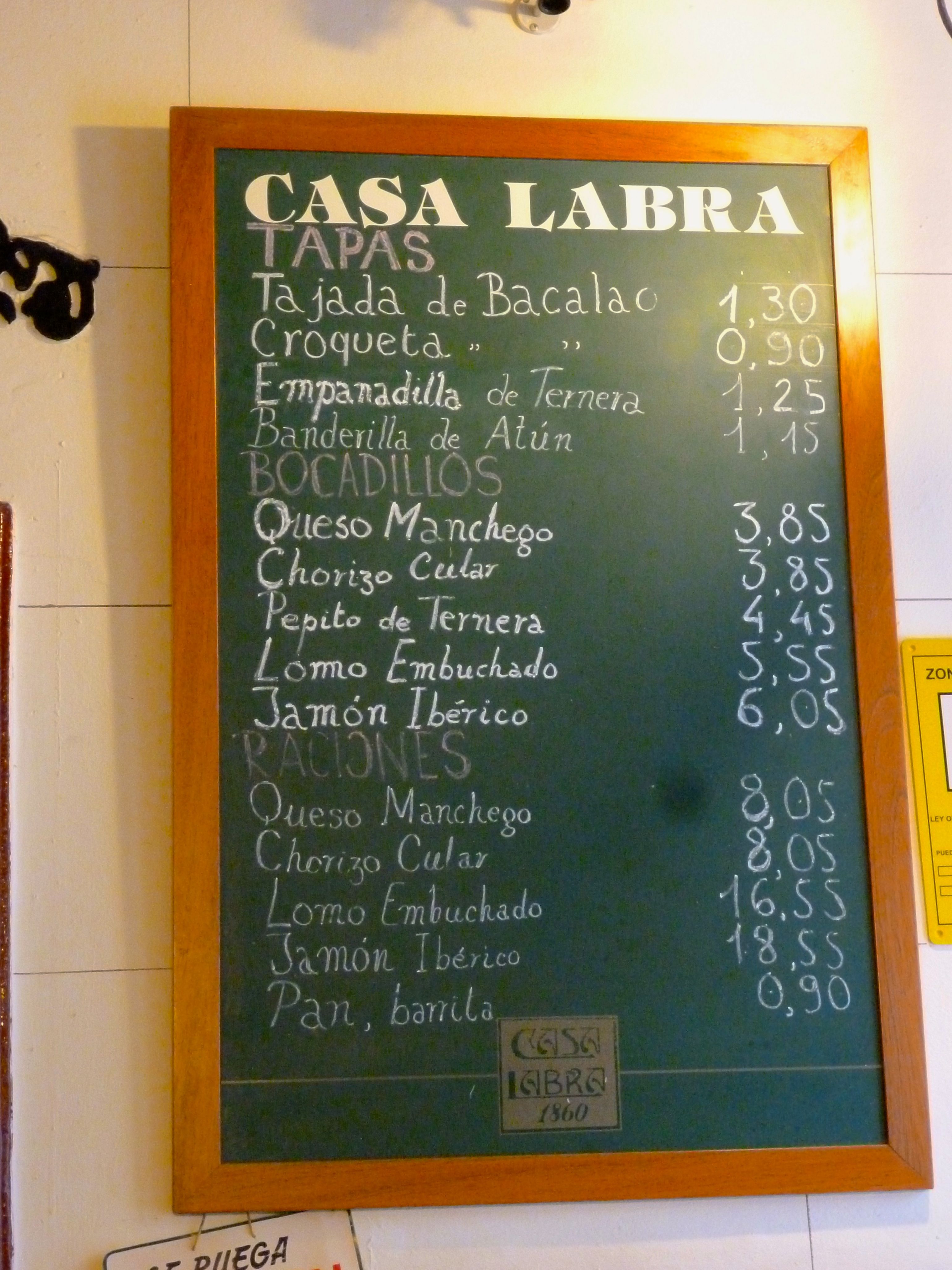 Casa Labra, una casa que practica la costumbre de las tapas desde hace 150 años. Aquí podemos inspirarnos para nuestro tapañol milanés. Os dejo algunos componentes de la lista: